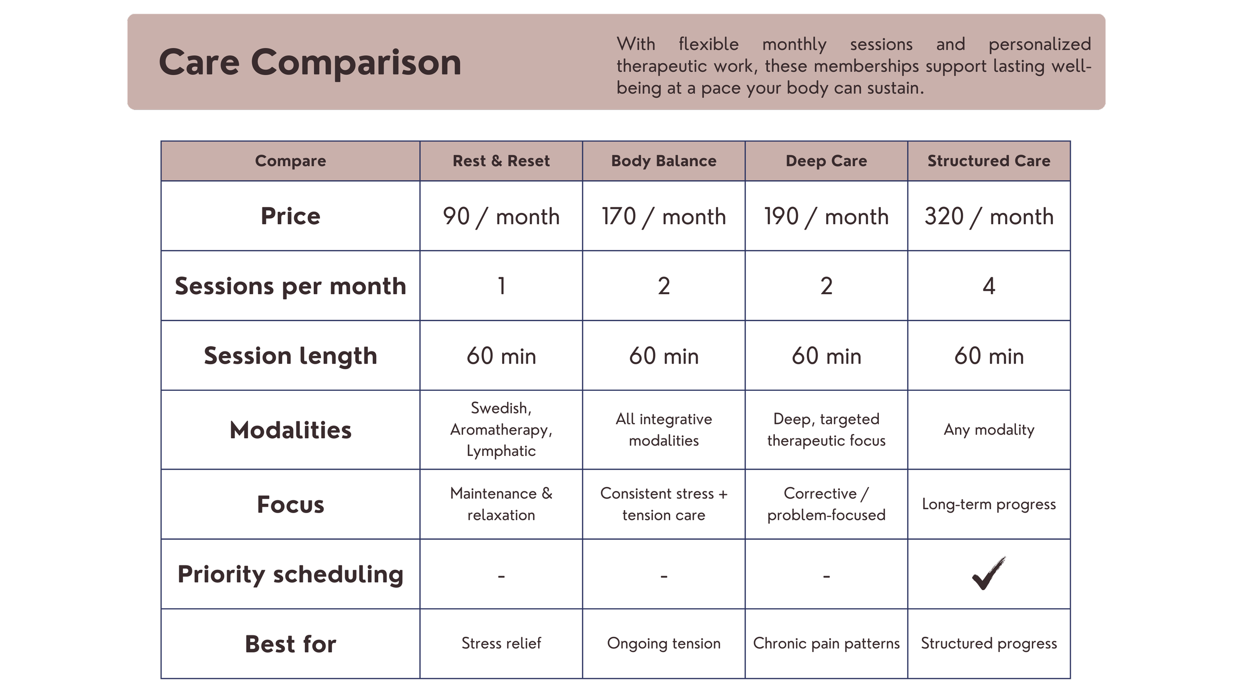 IChoose a plan based on how often tension returns or how much support your body needs. Many clients begin with Body Balance for consistent care and adjust over time.